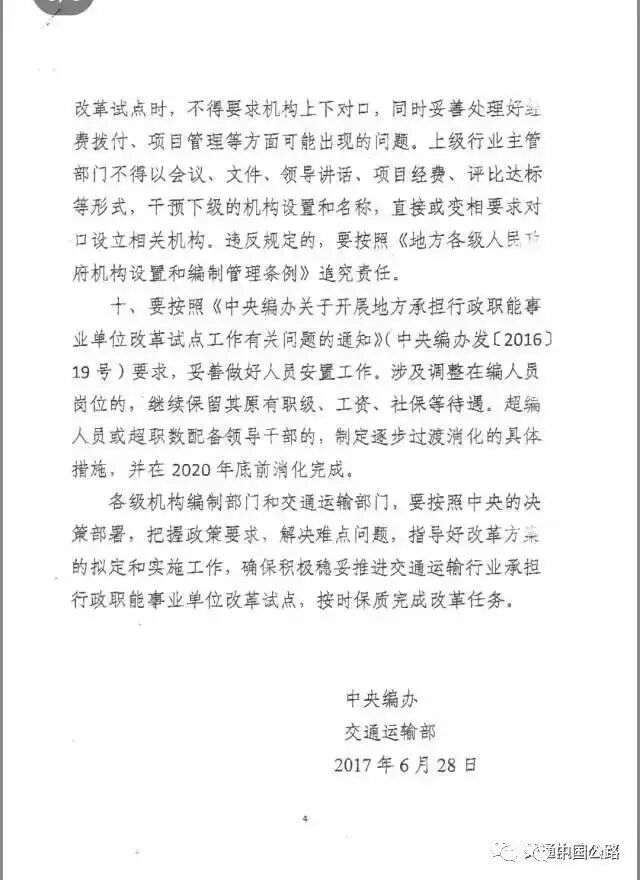 四、行政职能划归交通运输主管部门后,要尽可能整合现有内设机构的职能,综合设置内设机构。确需单独设置内设机构的,要相应减少事业单位数量,确保增减相抵后同一级别的机构数量不增加,力争有所减少。