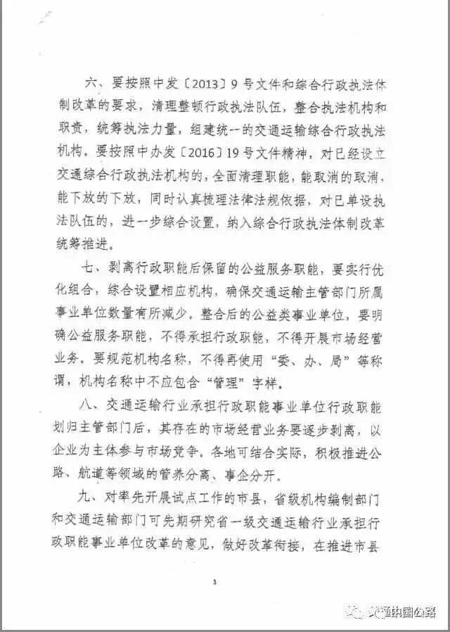 三、交通运输行业所有承担行政职能的事业单位都要纳入改革实施范围。要将事业单位承担的路政管理、道路运输管理、港航海事管理等职能中有关行政许可、行政裁决等行政职权,划归交通运输主管部门。