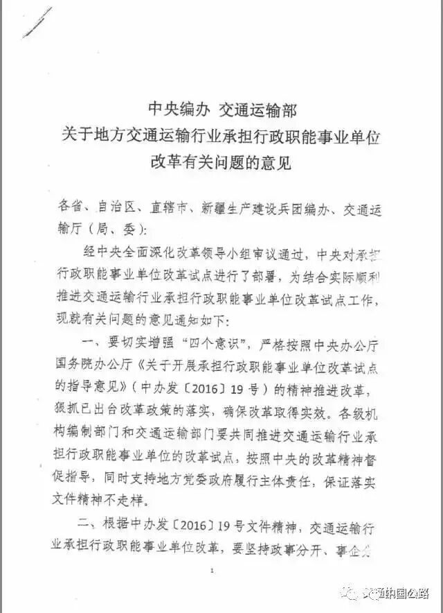 经中央全面深化改革领导小组审议通过,中央对承担行政职能事业单位改革试点进行了部署,为结合实际顺利推进交通运输行业承担行政职能事业单位改革试点工作,现就有关问题的意见通知如下: